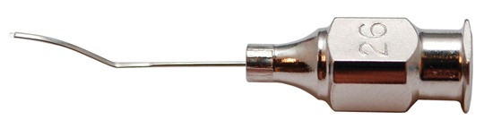 Calibre 26, eje angulado, 9 mm desde la curva hasta la punta, punta aplanada con forma de espátula...
